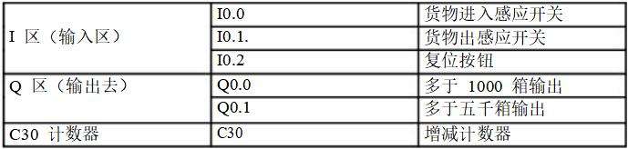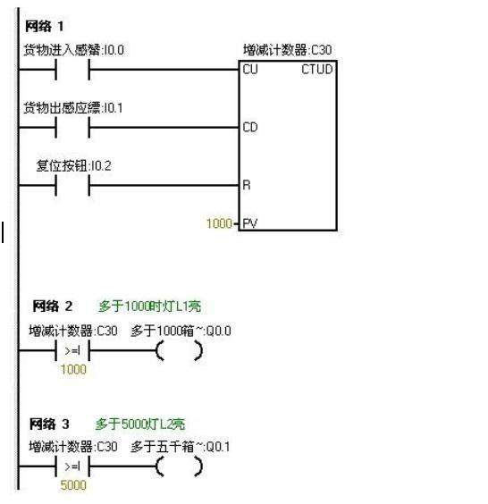 当按下在线控制面板上的I0.0f的时候即I0.0接通,表示有货物进去。当我们点击在线控制面板上的I0.0f五次后,此时计时器中的计数值为5,(即表示仓库中已经有1000箱物品了)则灯L1要亮,即Q0.0有输出。当继续点击I0.0f后点 击有十次后此时计数器的计数值位10(即表示仓库中有5000个物品),此时灯L2也亮即Q0.1有输出当继续点击在线控制面板上的I0.0f。计数器中的计数值就继续往上增加。当按下在线控制面板上的I0.1f后计数器就开始往下减。点击一次,计数器中的计数值就减少一次。当计数器中的值小于10时即表示仓库中的物品少有5000箱,此时灯L2灭(即Q0.1没有输出)当继续点击I0.1f时计数器 中的计数值继续减少,当减少到小于5次时。表示仓库中的物品少于1000,此时灯L1灭。Q0.0就没有输出。当按下在线控制面板上的I0.2f时计数器清零。L1和L2都不亮,(即Q0.和Q0.1都没有输出)。