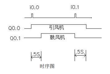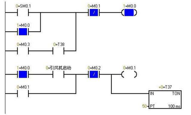 Sm0.1的特点在扫描的第一个周期接通,以后不接通。当按下在线控制面板上的i0.0f时即 i0.0接通,此时Q0.0接通输出,(即指示灯Q0.0亮)引风机启动,同时定时器T37接通并开始计时,当定时器计数到50即(即指示灯Q0.1亮)鼓风机启动。此时两台风机都运行。当按下在线控制面板上的I0.1f时,即接通I0.1此时鼓风机停止运行,(即指示灯Q0.1灭)同时定时器T38接通并开始计时,定时5s后引风机停止运行。(即指示灯Q0.0灭)。