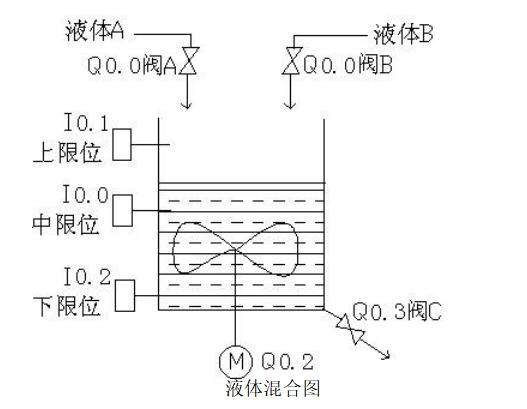 用S7-200实现液体混合的自动控制。当按下启动按钮后,液体阀A 打开,液体A流入搅拌机里面。当液位达到中限位时阀A关闭,同时打开液体阀B,液体B流入搅拌机里面。当液位达到上限位时,阀B关闭,此时启动电动机进行搅拌。搅拌一分钟后电动机停止同时阀门C打开,混合液体流出。当液位到达下限位时再过5S容器放空,关闭阀门C。同时打开阀门A,注入液体A。如此周期性的循环。若按下停止按钮后必须要等一个周期循环完后才停止。
