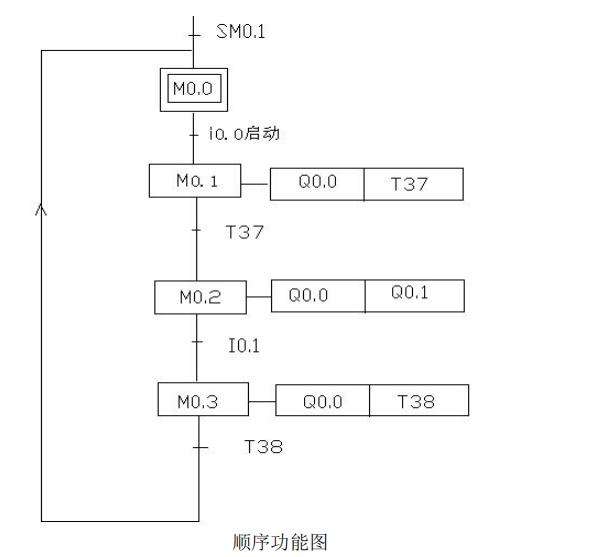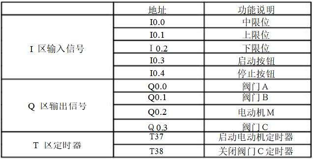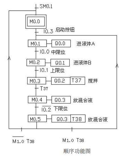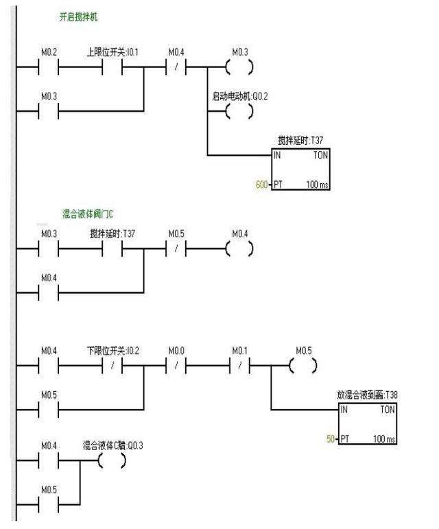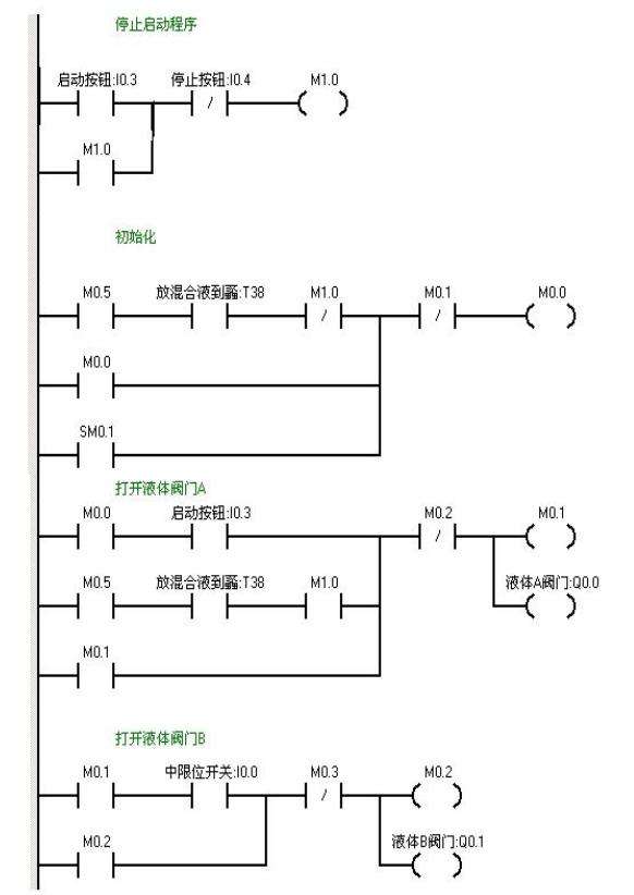 当按下在线控制面板上的I0.03f 即(I0.3闭合)阀A打开(即Q0.0亮),当按下在线控制面板上I0.0f(即I0.0中限位闭合)阀A关闭,阀B打开(即Q0.0灭,Q0.1 亮)当按下在线控制面板上I0.1f(即上限位I0.1闭合)此时阀B关闭,电动机启动开始进行搅拌,(即Q0.1灭,Q0.2亮)同时定时器T37开始定时一分钟,一分钟后搅拌机停止搅拌,阀C打开(即Q0.2灭,Q0.3亮)当液位到达下限位后阀C继续打开(即Q0.3亮)同时定时器T38开始定时。5s后阀C关闭。阀A打开,(即Q0.3灭,Q0.0亮),进入下一个循环周期。按下在线控制面板上的I0.4f(即表示停止的I0.4闭合)此时系统不会立即停止,而是当运行完一个周期后才停止。