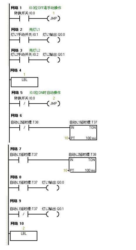 利用跳转指令控制两个灯L1和L2,分别接于Q0.0和Q0.1,切换开关位I0.0,两个灯的控制开关位I0.1和 I0.2.。手动时分别用两个灯的控制开关来控制。自动时,两个灯每隔一秒交替亮。