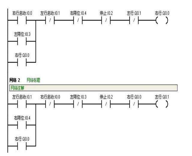 当按下SB2即i0.0(鼠标点击i0.0f)接通后,Q0.0接通,小车右行(即指示 灯 Q0.0 亮)。当小车运行碰到右限位开关SQ2即i0.4(用鼠标点击i0.4f,模拟SQ2被压下)接通,此时小车左行(指示灯Q0.0灭,指示灯Q0.1亮),当运行到左边碰到左限位SQ1即i0.3(鼠标点击i0.3f)接通,此时小车又往右运行(指示灯Q0.1灭,指示灯Q0.0 亮)。如此往返运动下去直到按下SB1即i0.2(鼠标点i0.2f)接通,小车停止运行。