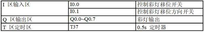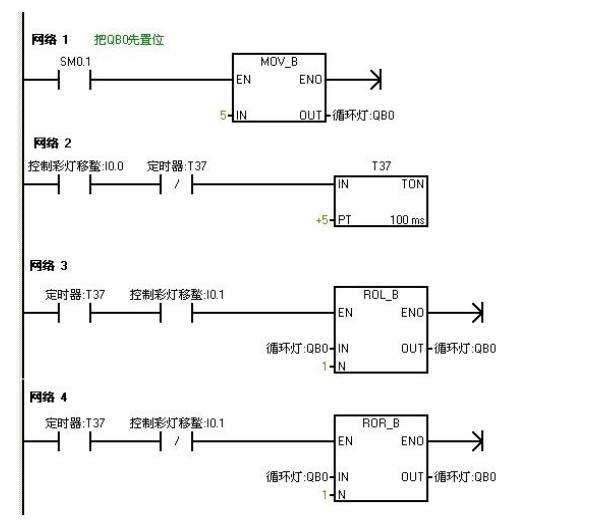 用IO导线控制接在Q0.0到Q0.7上的八个彩灯循环移位,用t37定时,每0.5S移位一位,首次扫描时给Q0.0到Q0.7置初值,让Q0.0和Q0.2先有输出。用I0.1来控制彩灯位移的方向。