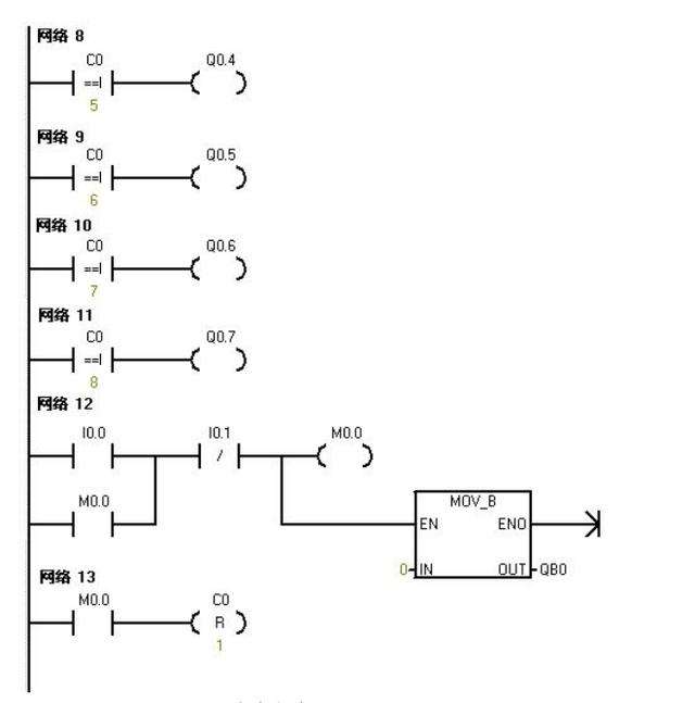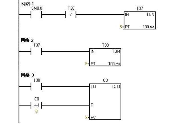 PLC一上电后sm0.0一直保持接通。所以t37进行延时计时,延时到后启动t38计时,t38计时到后t38常闭触点断开所以t37断开计时,t37常开触点恢复为常开所以t38也断开计时。此时t38的常闭触点恢复为常闭所以t37又重新计时,同时计数器C0开始计数一次。如此的反复计数。当计数为1时,Q0.0接通。计数器计数为2时Q0.1接通……如此下去当计数器计数到8时Q0.7接通。当计数器计到9时计数器C0清零。当按下在线控制面板上的I0.0f(即I0.0)接通,此时计数器,和Q0.0~Q0.7都清零,即没有一个灯亮。当按下在线控制面板上的I0.1f(即I0.1接通)此时计数器开始重新计数,灯又从Q0.0开始重新一个接一个的往下亮。