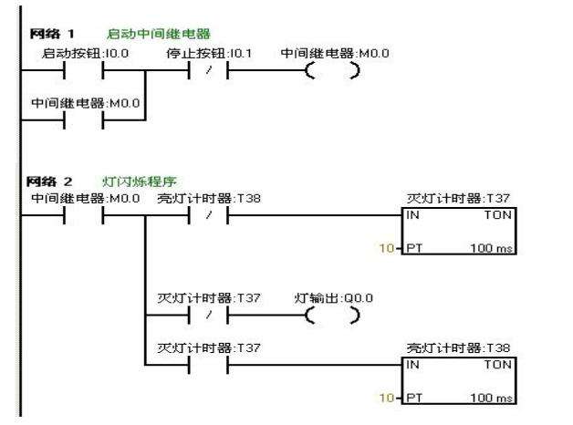 把编写好的程序下载到西门子s7-200PLC中进行调试。观察运行结果和实验要求 是否相同。通过在线控制面板进行调试,当按下在线控制面板上的I0.0f(即 I0.0 接通)此时Q0.0有输出,Q0.0所接负载灯就亮,同时启动定时器T37开始计时, 当计时一秒后因T37动作,其常闭触点断开,所以Q0.0无输出,所接负载灯灭。灯灭的同时启动定时器 T38,T38 计时一秒后,把串联在定时器T37的常闭触点 断开,所以T37复位,T37常闭触点恢复常闭。此时Q0.0 又有输出, 所接负载灯又亮。这样,输出Q0.0上所接的负载灯以接通一秒,断开一秒频率不停的闪烁,直到按下在线控制面板上的 I0.1f(即I0.1接通),闪光电路不在继续工作。若想改变灯闪烁的频率只要改变定时器的时间就能够达到改变要求。
