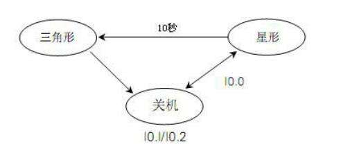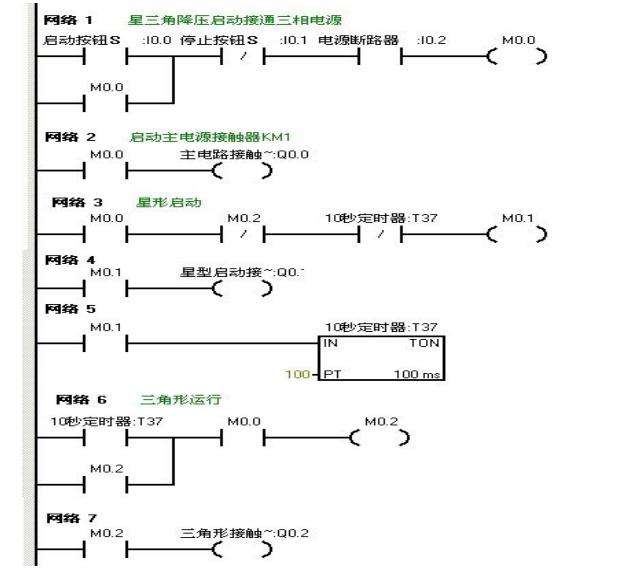 把编写好的程序下载都西门子S7-200的PLC中进行调试,下载好后我们打开在线控制面板进行调试,看运行结果是否符合要求。首先把控制面板上的i0.2f置位为按钮按下去,即i0.2 接通,表示断路器QF合上。按下启动按钮i0.0f(SB2)即i0.0接通此时电动机星形启动,Q0.0和Q0.1有输出,实验接线图中表示这两个的灯L1和L2都亮同时驱动时间计数器,当计时器计到10S时切换为三角型启动,此时Q0.1无输出,Q0.2有输出,则此时Q0.0和Q0.2 有输出,电机三角星运行。接线面板上的L 1和L3灯亮。按下在线面板上的i0.1f后(i0.1接通)此时电动机停止运行。所以的输出点都无输出。